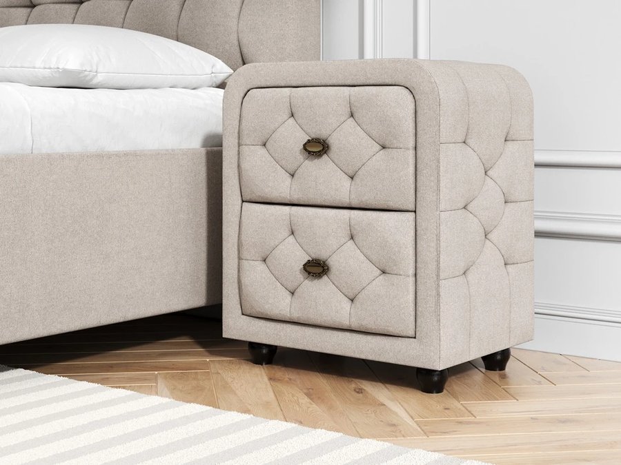 Каркас тумбы выполне из ДСП. В качестве обивочного материала используется экокожа класса "Люкс" или мебельная ткань на выбор.